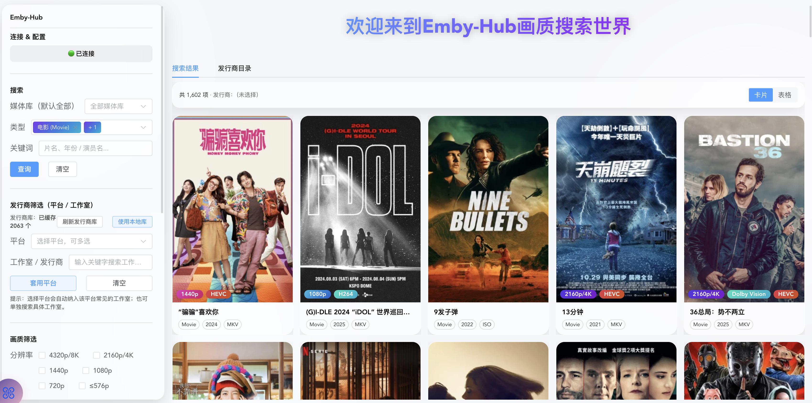 emby-hub 功能介绍Emby-Hub介绍 截至目前最新版本1.5 接下来会介绍1.5版本所有的功能 主菜单所有按钮主菜单按钮主菜单所有功能统计分析、系统管理、退出登录、影片推荐、欢迎页、探索影片、用户管理、卡密管理、媒体管理 系统管理系统管理系统管理所有功能实时...2025-09-14技术